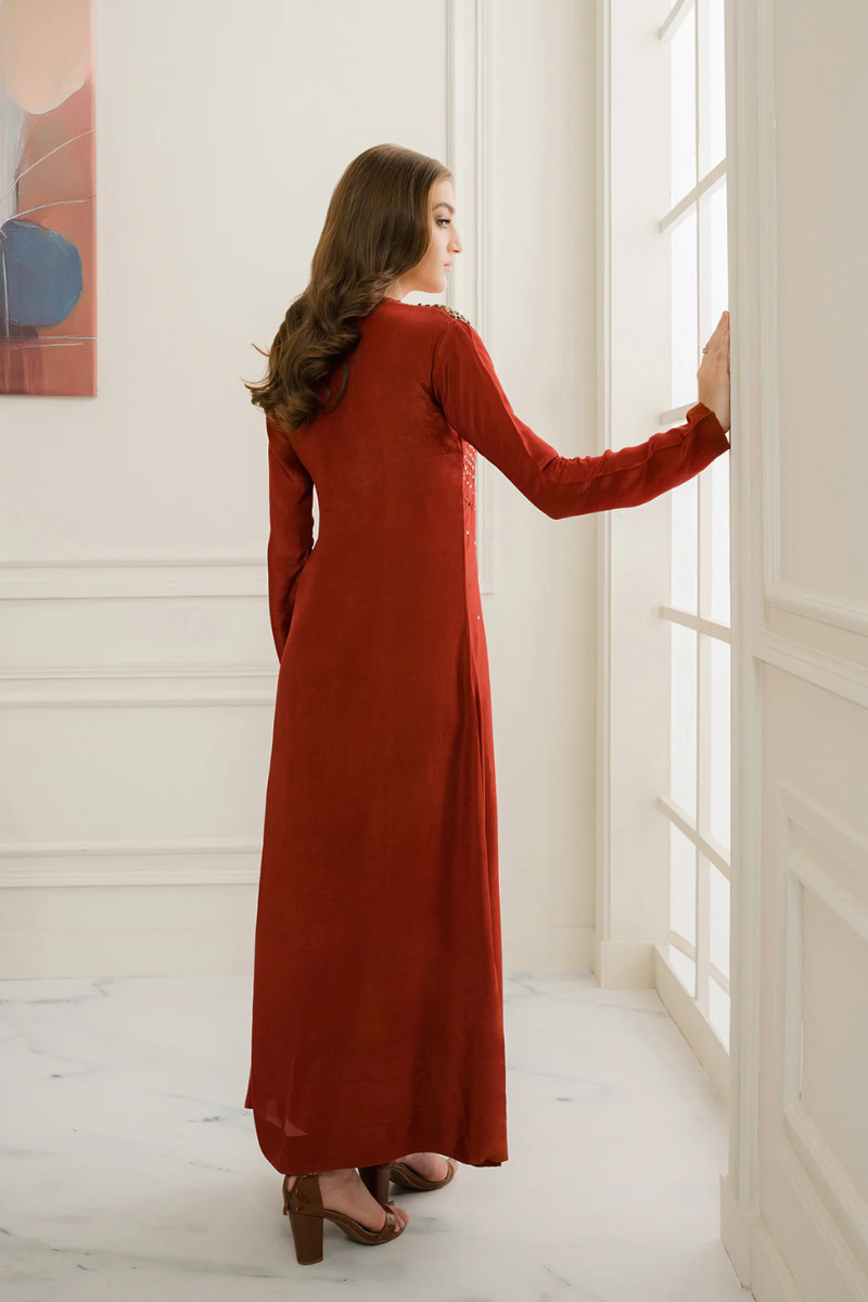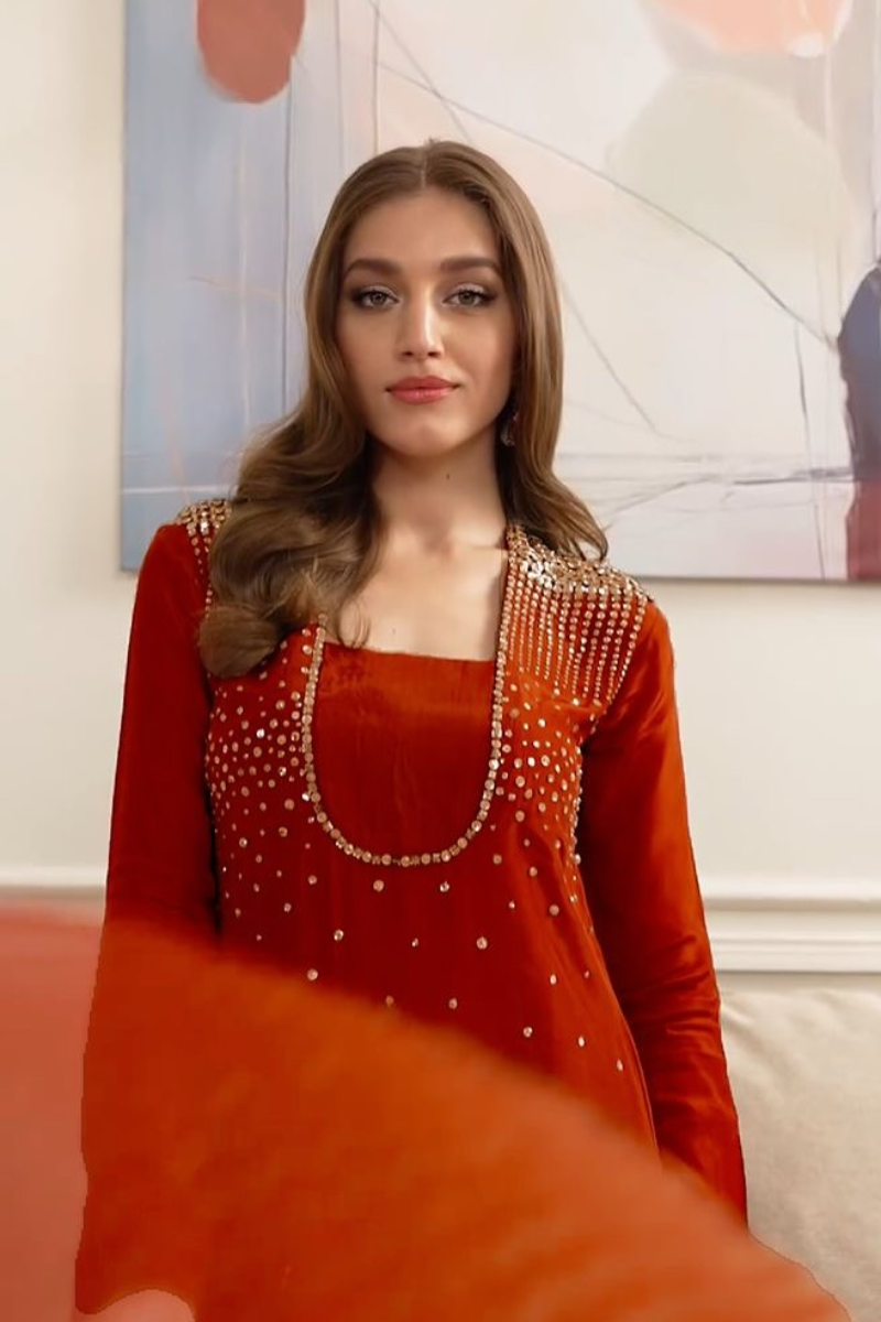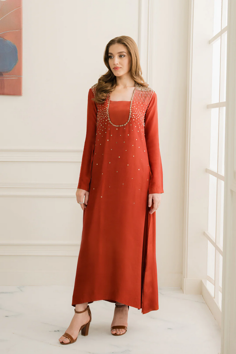 This elegant dress, crafted in premium raw silk, features an elongated U-neckline adorned with delicate crystal embellishments and a graceful crystal spray along the front and neckline. Designed with full-length sleeves and an A-line silhouette, it offers timeless sophistication.