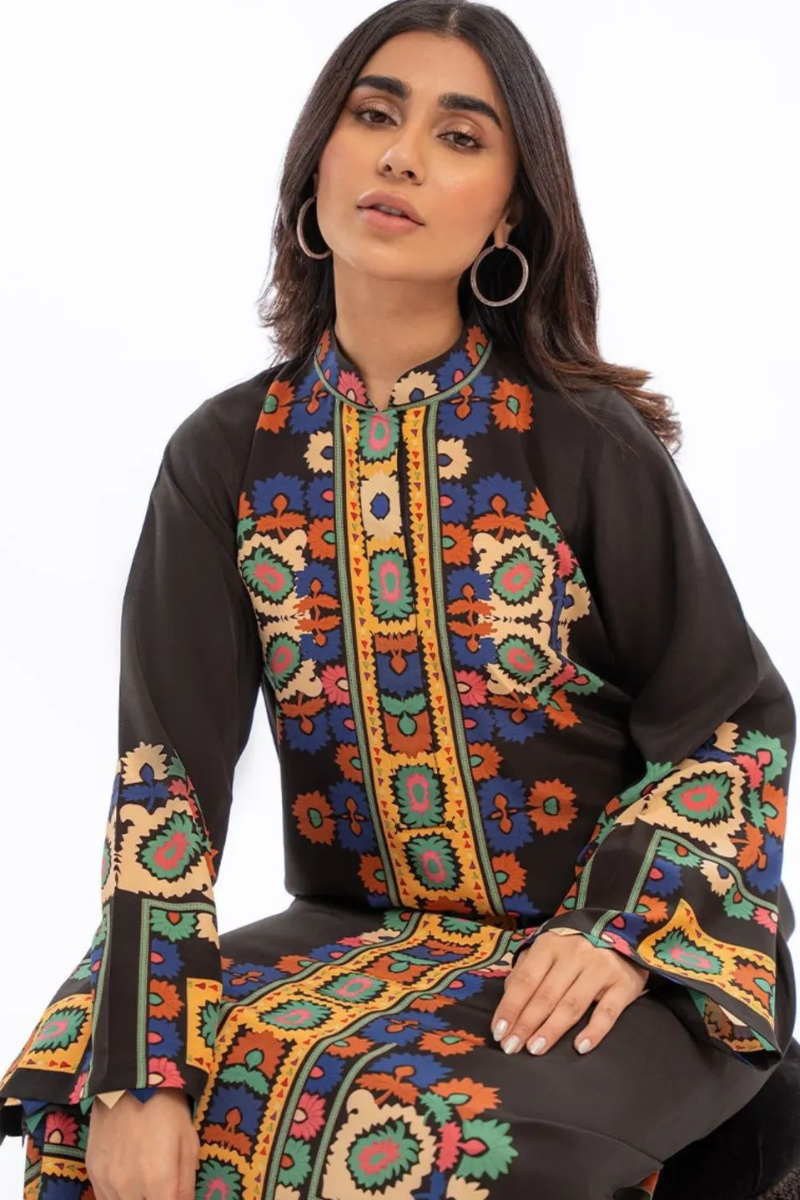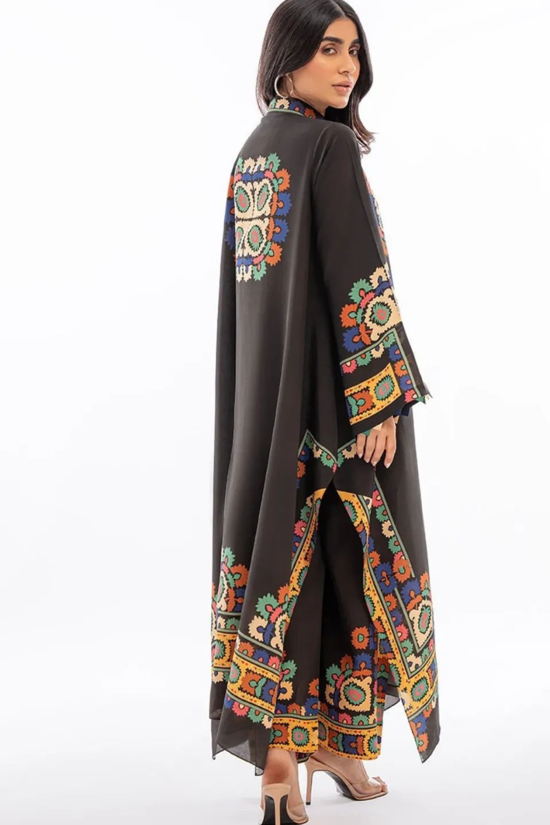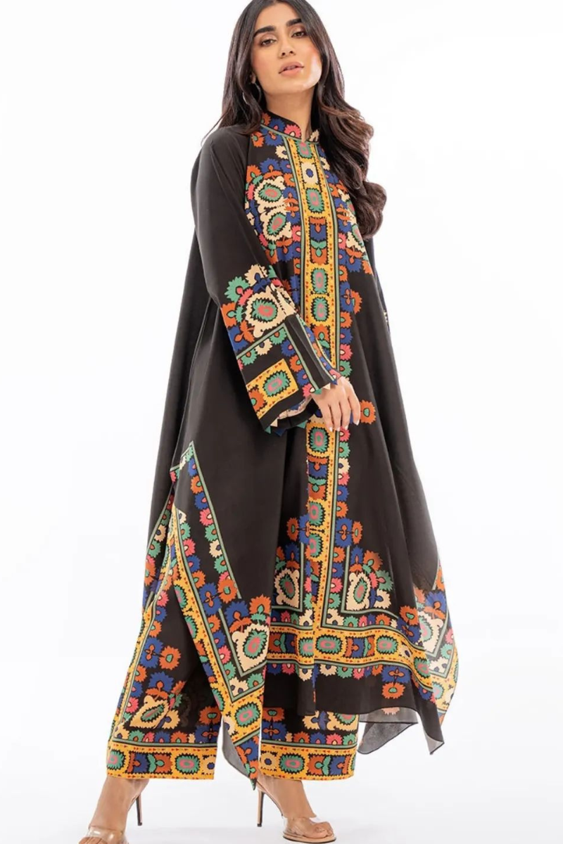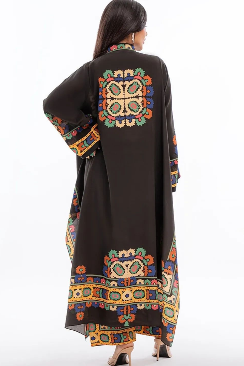 The Artisan Fusion Long Dress is a captivating blend of style and comfort. Crafted from high-quality Premium Crepe, this set features a sweeping, longline shirt (51 inches) in classic black, dramatically offset by rich, colorful borders and cuffs that mimic vibrant cultural embroidery. The relaxed fit of the accompanying 40-inch flapper trousers ensures effortless grace. Perfect for making an impact, this ensemble is an essential addition to your formal or festive wardrobe.
