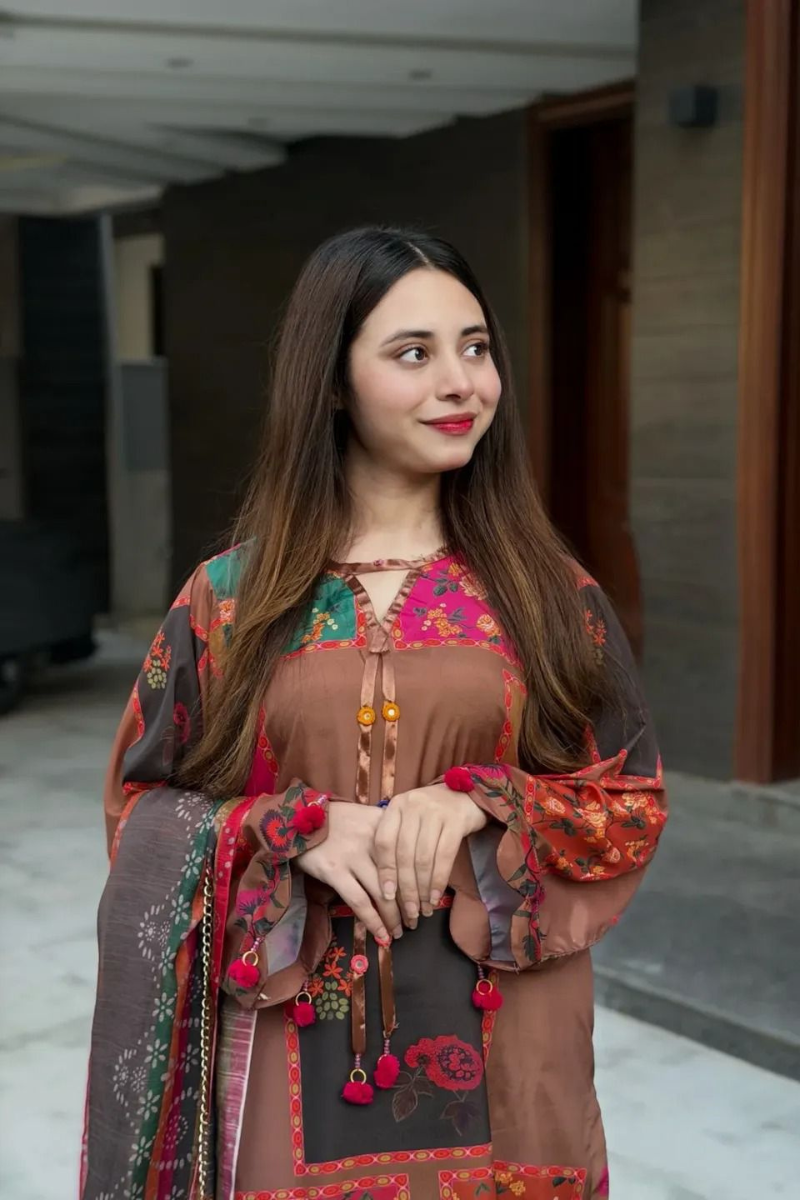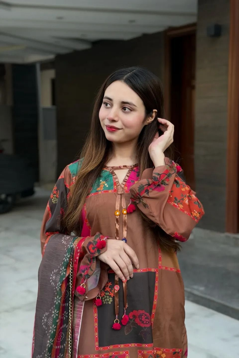 A stylish two-piece printed outfit with a long shirt and matching shalwar, made from premium crepe fabric. Featuring elegant floral patterns and fine neckline detailing, it offers a comfortable, lightweight fit perfect for casual and semi-formal wear.