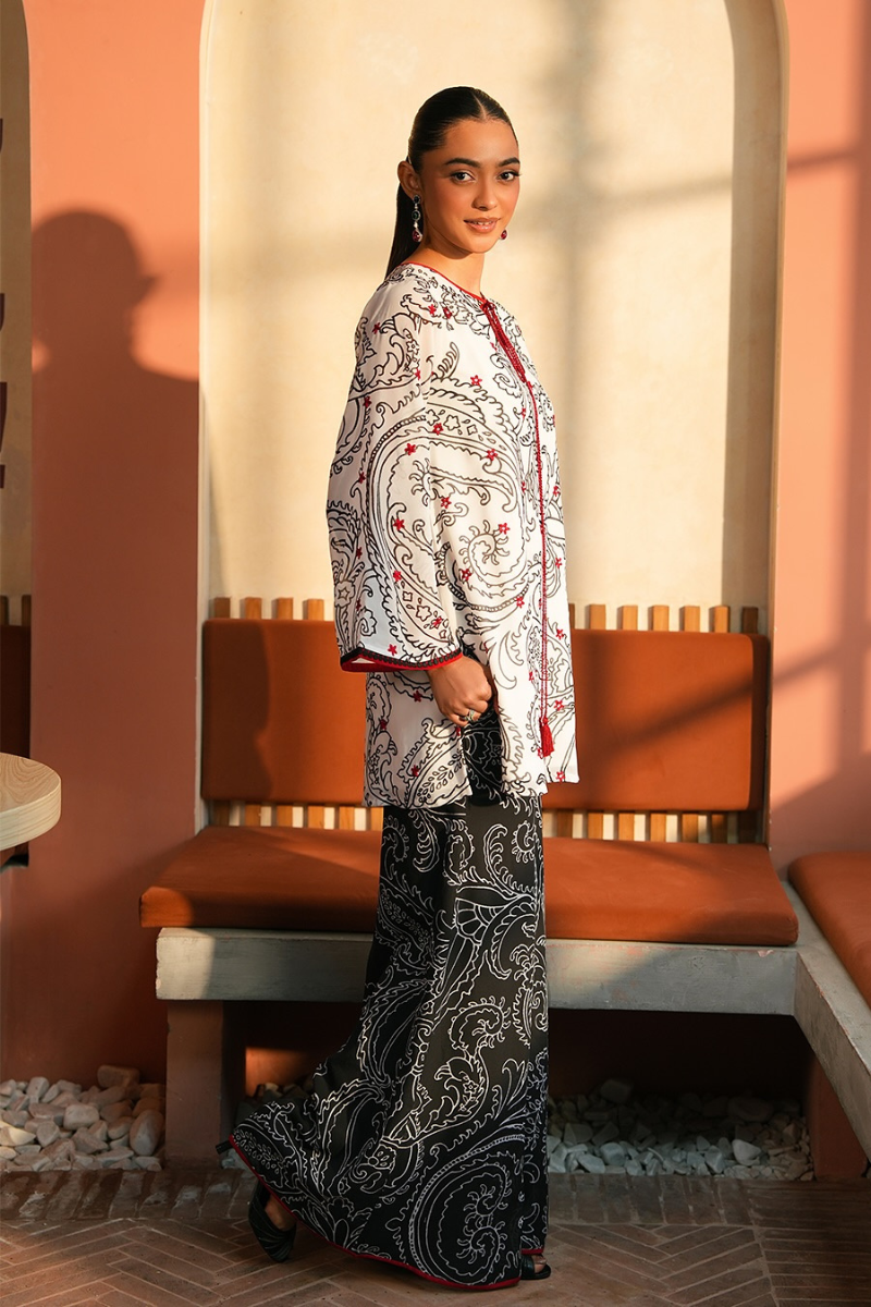 A modern yet traditionally inspired two-piece crafted in premium crepe. The ensemble features a detailed paisley print enhanced with subtle red accents, creating an elegant, standout look. Its soft, breathable crepe fabric ensures all-day comfort, while the relaxed silhouette makes it ideal for casual and semi-formal wear. A perfect blend of style, grace, and effortless sophistication.